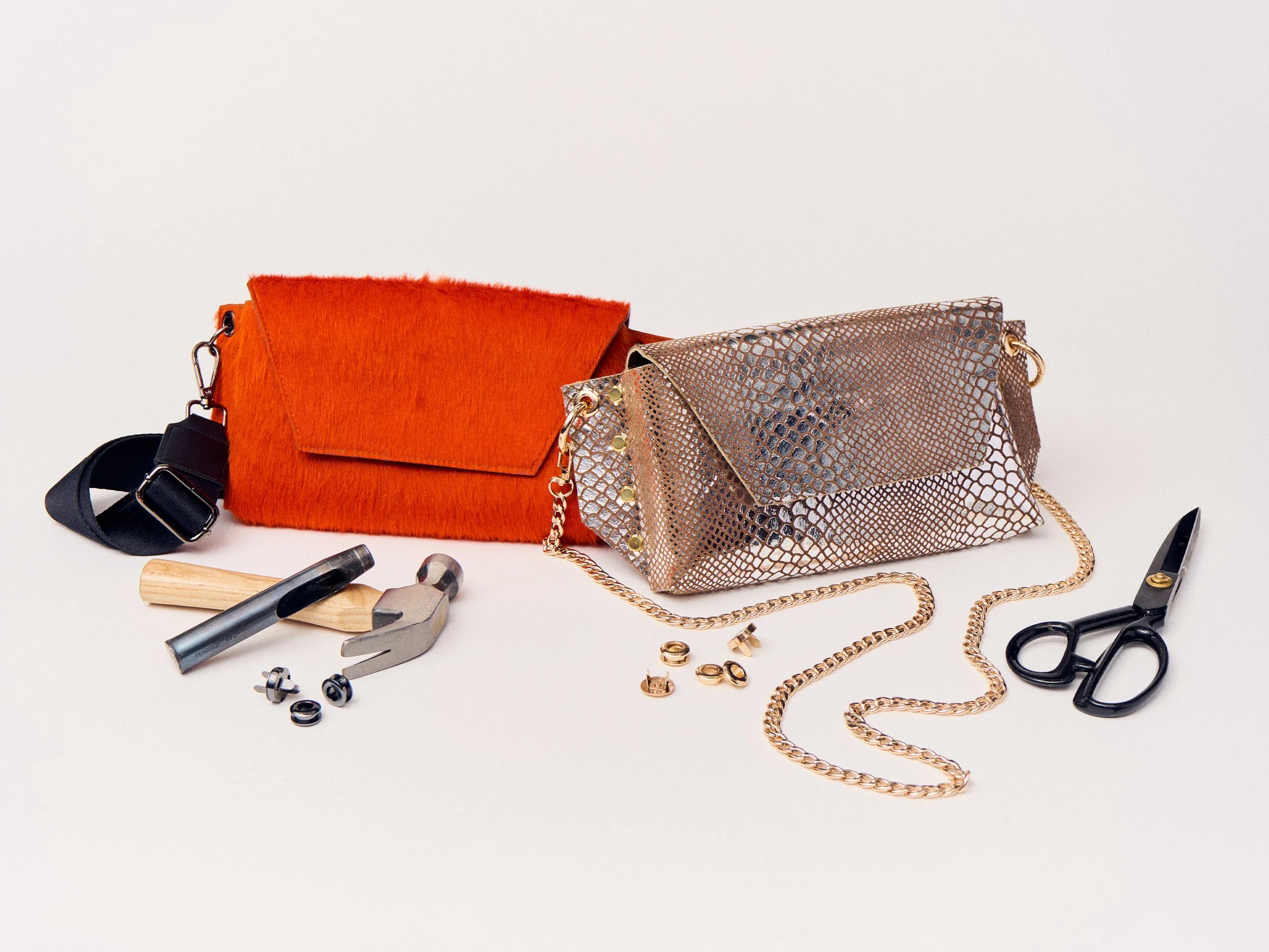Design a fashionable and functional crossbody bag, 12” wide by 6” tall. Choose from a variety of leather prints and hardware to tailor your piece.